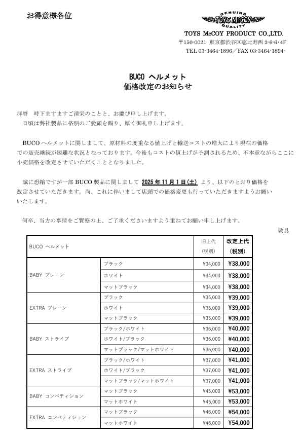 レイト商会ECサイト お知らせ一覧 BUCO 価格改定 11月1日より BUCO 価格改定 11月1日より ニュース ☆ 10月03日更新 ブレイドライダー 在庫表 ☆ エアーヘッドにつきまして 日付 2025/10/01 内容 BUCO価格改定 11月1日より 添付ファイルダウンロード ファイルをダウンロード 20251001_BUCO_price.pdf ☆ 10月03日更新 ブレイドライダー 在庫表 ☆ エアーヘッドにつきまして お知らせ一覧へ