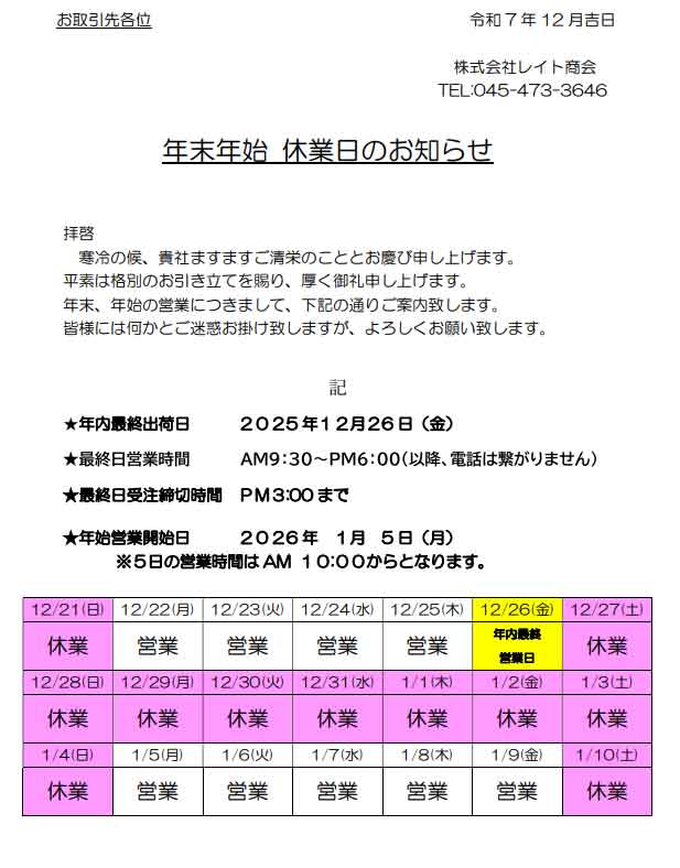 レイト商会ECサイト お知らせ一覧 年末年始 休業のお知らせ 2025/12/27~2026/1/4 年末年始 休業のお知らせ 2025/12/27~2026/1/4 ニュース 12月10日 営業時間変更 日付 2025/12/12 内容 添付ファイルダウンロード ファイルをダウンロード 20251212_eigyou.pdf 12月10日 営業時間変更 お知らせ一覧へ