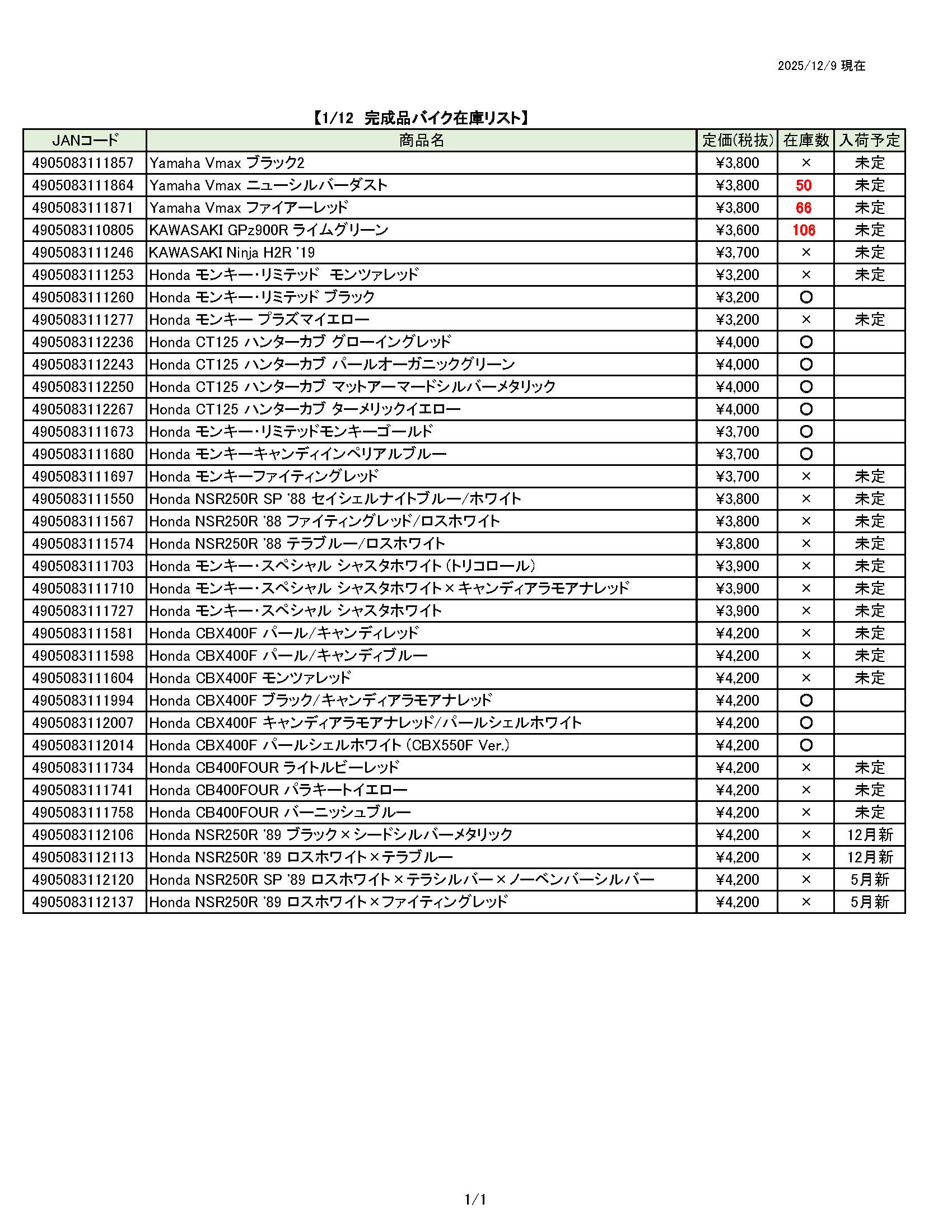レイト商会ECサイト お知らせ一覧 ☆ 12月08日更新 青島文化教材社 在庫表 ☆ ☆ 12月08日更新 青島文化教材社 在庫表 ☆ ニュース ☆ 12月12日更新 SNOOPY 在庫表 ☆ ☆ 11月28日更新 レイト商会オリジナル品 在庫表 ☆ 日付 内容 ☆ 12月08日更新 青島文化教材社 在庫表 ☆ 添付ファイルダウンロード ファイルをダウンロード アオシマ完成品バイク メーカー在庫表(12.08).pdf ☆ 12月12日更新 SNOOPY 在庫表 ☆ ☆ 11月28日更新 レイト商会オリジナル品 在庫表 ☆ お知らせ一覧へ