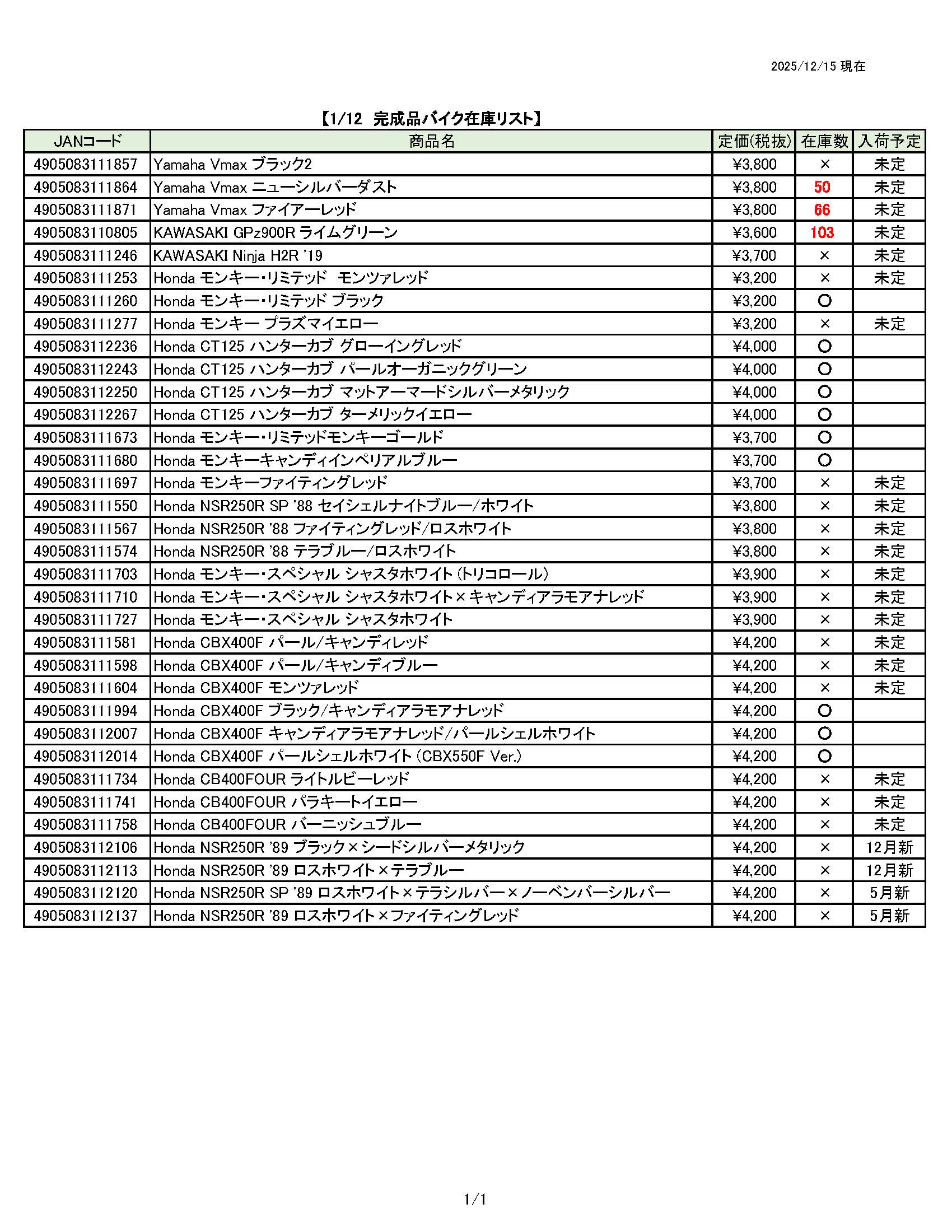 レイト商会ECサイト お知らせ一覧 ☆ 12月15日更新 青島文化教材社 在庫表 ☆ ☆ 12月15日更新 青島文化教材社 在庫表 ☆ ニュース ☆ 12月19日更新 SNOOPY 在庫表 ☆ ☆ 12月12日更新 リード工業 在庫表 ☆ 日付 内容 ☆ 12月15日更新 青島文化教材社 在庫表 ☆ 添付ファイルダウンロード ファイルをダウンロード アオシマ完成品バイク メーカー在庫表(12.15).pdf ☆ 12月19日更新 SNOOPY 在庫表 ☆ ☆ 12月12日更新 リード工業 在庫表 ☆ お知らせ一覧へ