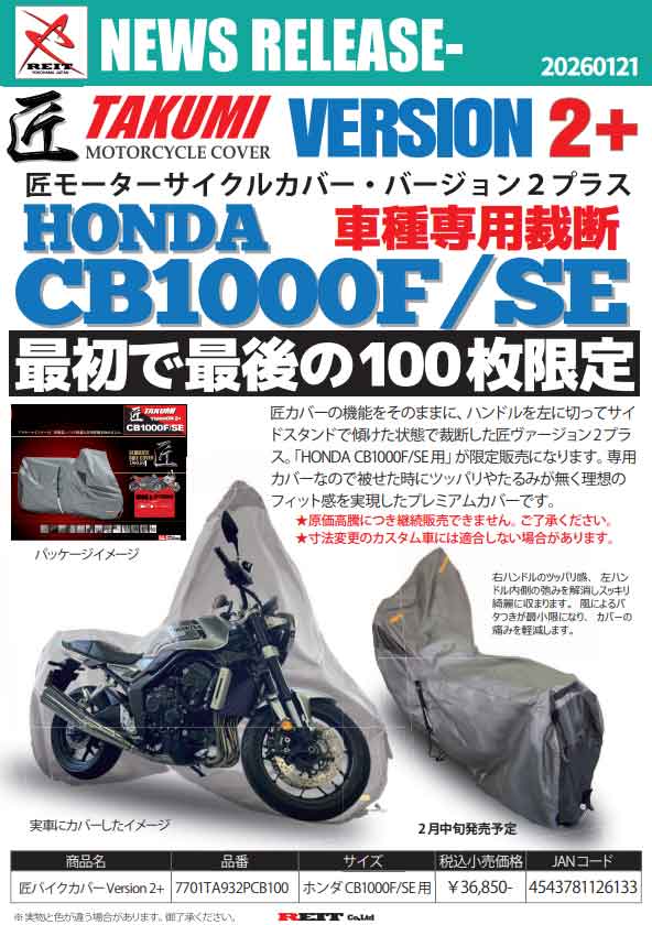レイト商会ECサイト お知らせ一覧 匠車種専バイクカバー CB1000F/SE 2月中旬 100枚限定発売 匠車種専バイクカバー CB1000F/SE 2月中旬 100枚限定発売 ニュース 寒波の影響によるお荷物のお届け遅延について カエディア商品、バラ取寄せ商品の納期について 日付 2026/01/21 内容 匠バイクカバー Ver2+ 車種専 CB1000F/SE 2月中旬 100枚限定発売 添付ファイルダウンロード ファイルをダウンロード 20260121_TAKUMIV2PCB1000.pdf 寒波の影響によるお荷物のお届け遅延について カエディア商品、バラ取寄せ商品の納期について お知らせ一覧へ