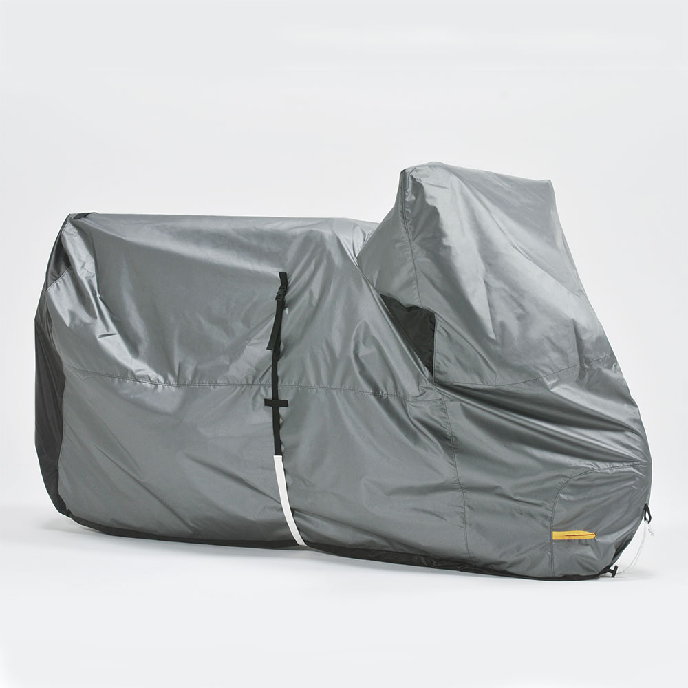 バイクカバー「匠」は独自の二重構造。雨、風、埃、紫外線からバイクを守るため、カバーの製造を外側と内側別々にし、各部に最高級の素材を使用しました。それぞれに独自の立体裁断を採用し、通常カバー2枚分の手間を掛けて製造しています。アウターはガンメタコーティングを施すことで紫外線による劣化を防ぎ、浸水の軽減と接合部の縫製強度アップにため、二重縫製で仕上げています。インナーは、バイクへの擦れキズ軽減と耐熱性の高い素材を各パートごとに使用しています。日常の使い勝手やフィッティング等、バイクカバーに求められる条件に高いレベルでお応えすべく、職人の技術によって造りこまれた逸品です。